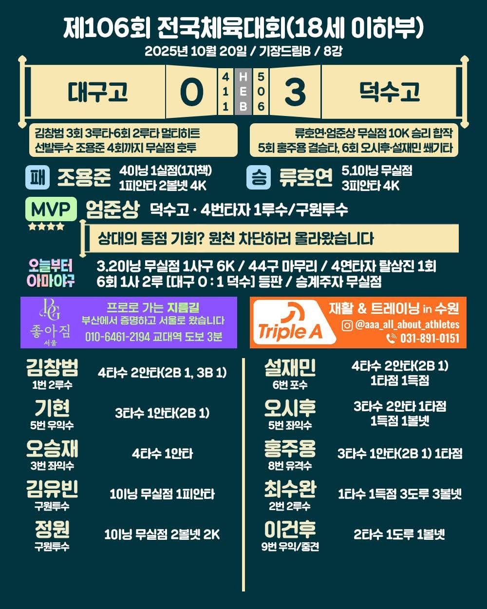 2025년 10월 18일부터 제106회 전국체육대회 고등부 야구 경기가 기장드림볼파크(부산 소재)에서 시작됩니다.첫날 덕수고는 경남 용마고등학교와의 경기를 치를 예정이오니, 많은 관심과 뜨거운 응원 부탁드립니다.