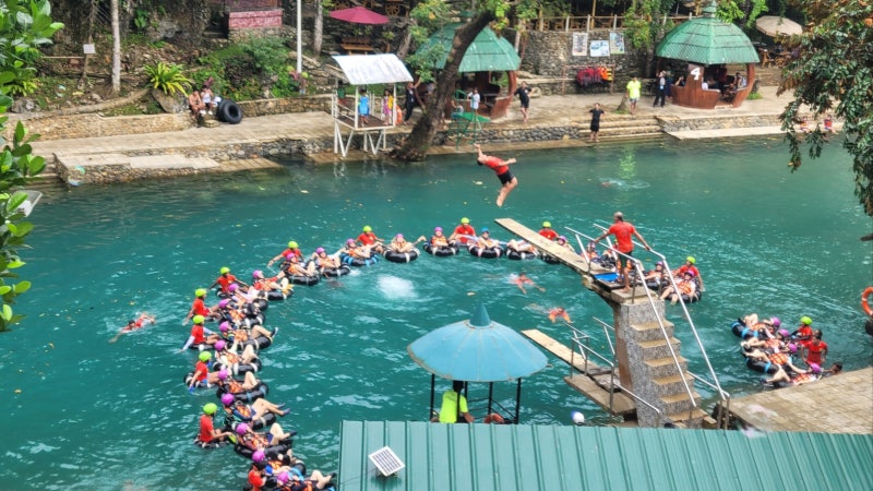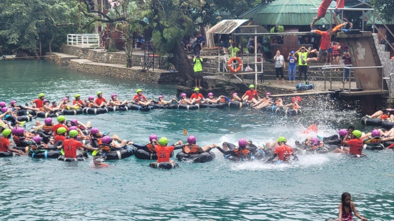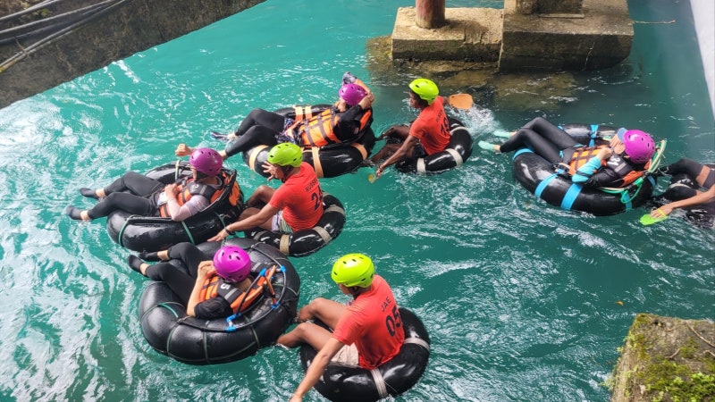 안전한 튜브 타기: 드디어 우리 차례가 되어 30명 단위로 계곡 위에서 튜브를 타고 물살을 헤치며 내려오는 짜릿한 놀이를 즐겼다. 가이드가 한 명씩 붙어 안전하게 인솔해주어 더욱 안전하게 물놀이를 즐길 수 있었다.