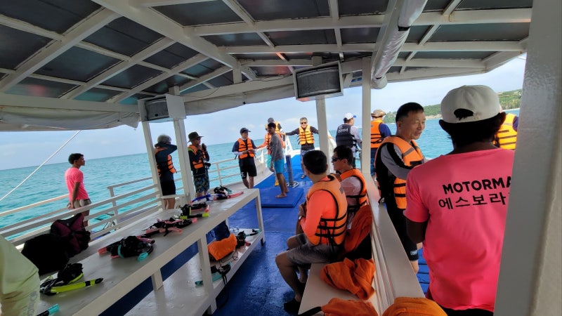 바다 만끽: 06시 아침 식사 후 해변 산책을 즐긴 뒤, 배를 타고 호핑투어를 했다. 섬을 일주하며 아름다운 바다와 섬을 보며 우리나라와는 다른 매력을 느꼈다. 수경을 쓰고 바닷속의 고기와 산호를 감상하며 바다에 흠뻑 빠져보기도 하고 삼삼오오 사진 찍으며 즐거운 시간을 보냈다.